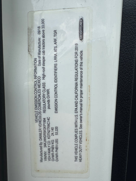 2019 FREIGHTLINER CASCADIA 126, DD15, DT-12 AUTO, 730k miles, TK APU